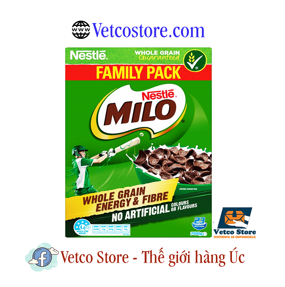 Thành phần chứa Sữa và Đậu nành Ngũ cốc nguyên hạt (50%) [Lúa mì (34%), Ngô (16%)], Đường, Công thức Thực phẩm bổ sung Cơ sở: Milo (10%) [Chiết xuất mạch nha (Lúa mạch và Gạo và / Hoặc Lúa mì), Sữa bột, Đường, Ca cao, Chất nhũ hóa (Lecithin đậu nành), Khoáng chất (Canxi, Sắt), Vitamin (C, B3, B6, B2, B12, A, D)], Bột mỳ, Ca cao, Chiết xuất mạch nha, Sữa bột tách kem, Dầu hướng dương, Chất nhũ hóa (Lecithin đậu nành), Hương liệu (Sô cô la và vani), Muối. Vitamin và khoáng chất Khoáng chất (Canxi, Sắt, Kẽm), Vitamin (C, Niacin, E, B1, B2, B6, Axit folic, D).