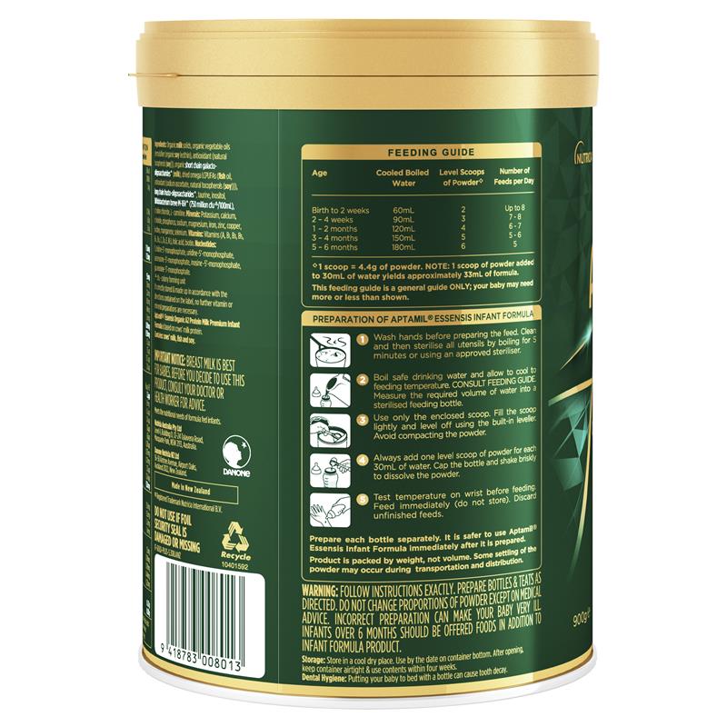 – Aptamil® Essensis Organic A2 Protein Milk Premium Formula dựa trên protein sữa bò. Thành phần: sữa bò, cá và đậu nành.