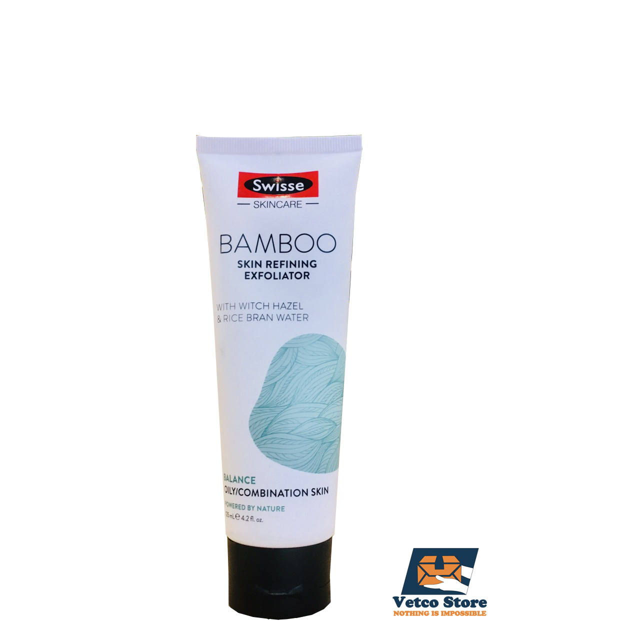 - Swisse Bamboo Skin Refining Eccfoliatior là sản phẩm tẩy tế bào chết dịu nhẹ có chiết xuất bột thân tre giúp loại bỏ tế bào chết và mang lại làm da mềm mịn và dẻo dai. Sản phẩm có chứa nhiều thành phần nước cảm gạo, thành phần này giúp cấp ẩm cho da và tăng cường sự rạng rỡ tự nhiên cho da.